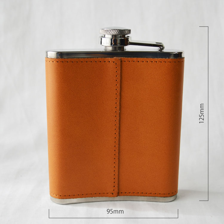 サイズ W95mmxH125mmx厚み20mm 材 質 ステンレススチール、蝶番プラスチック、レザー(合成皮革) 容 量 7oz(約207ml) 備 考 ブランデー、ワイン等酸化の強い飲料はステンレスを金属腐蝕させ、味や色の変質の原因になります。