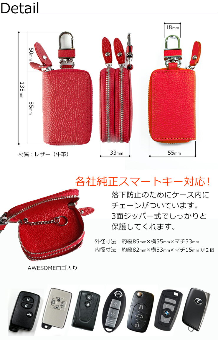 スマートキーケース 小銭入れ付き ダブルファスナータイプ(全6色) 本革 本格レザースマートキーカバー トヨタ ホンダ 日産 スズキ ダイハツ マツダ スバル 三菱 プリウススマートキーケース キーケース スマートキー 財布 コインケース ダブルキーケース