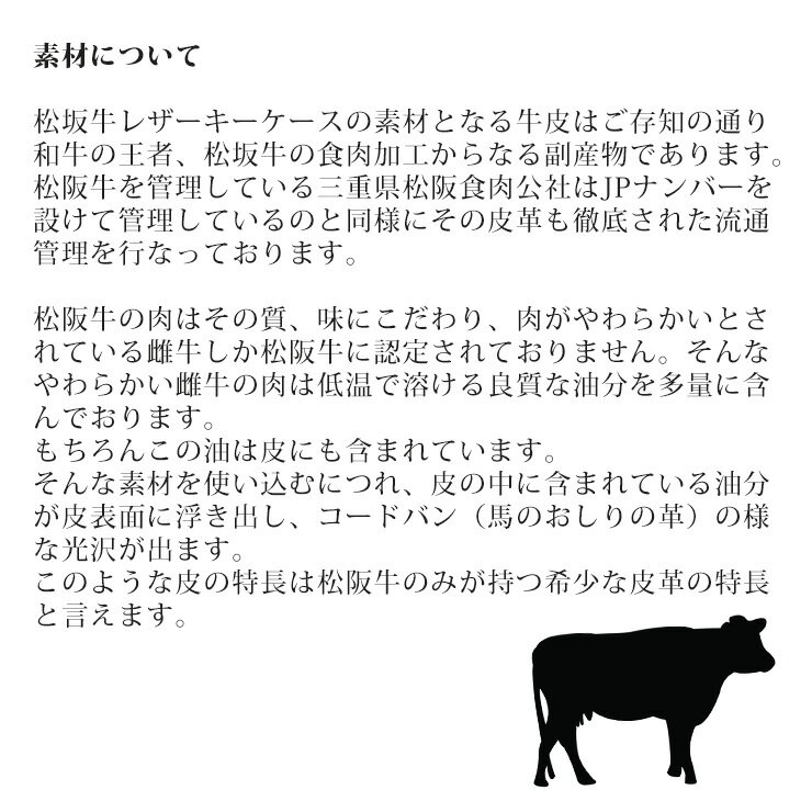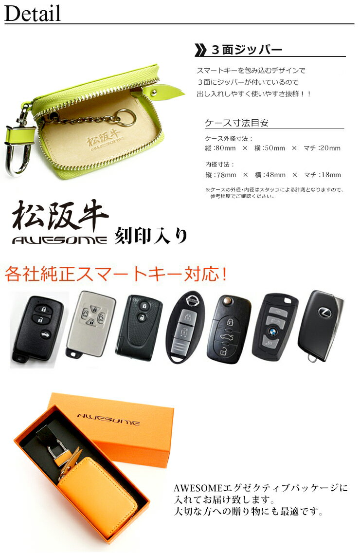 日本製 最高級 松阪牛レザーキーケース 和牛の最高峰ブランド「松阪牛」とAWSOMEの大人気スマートキーケースのコラボが実現しました! 素材に和牛の最高峰ブランド「松阪牛」の皮を使用し、松阪牛レザーに含まれる特殊な油脂が、独特な柔らかさと風合いをもたらし、使いこむほどに松阪牛ならではの光沢感が生まれてきます。