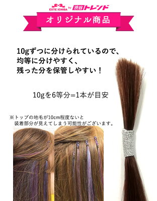特長 弊社オリジナルの編み込みエクステは 10gずつ束になっているので均等に分けやすく、 残った分も保管しやすい! また、毛先が重めなので少ない量で存在感のある量になります。